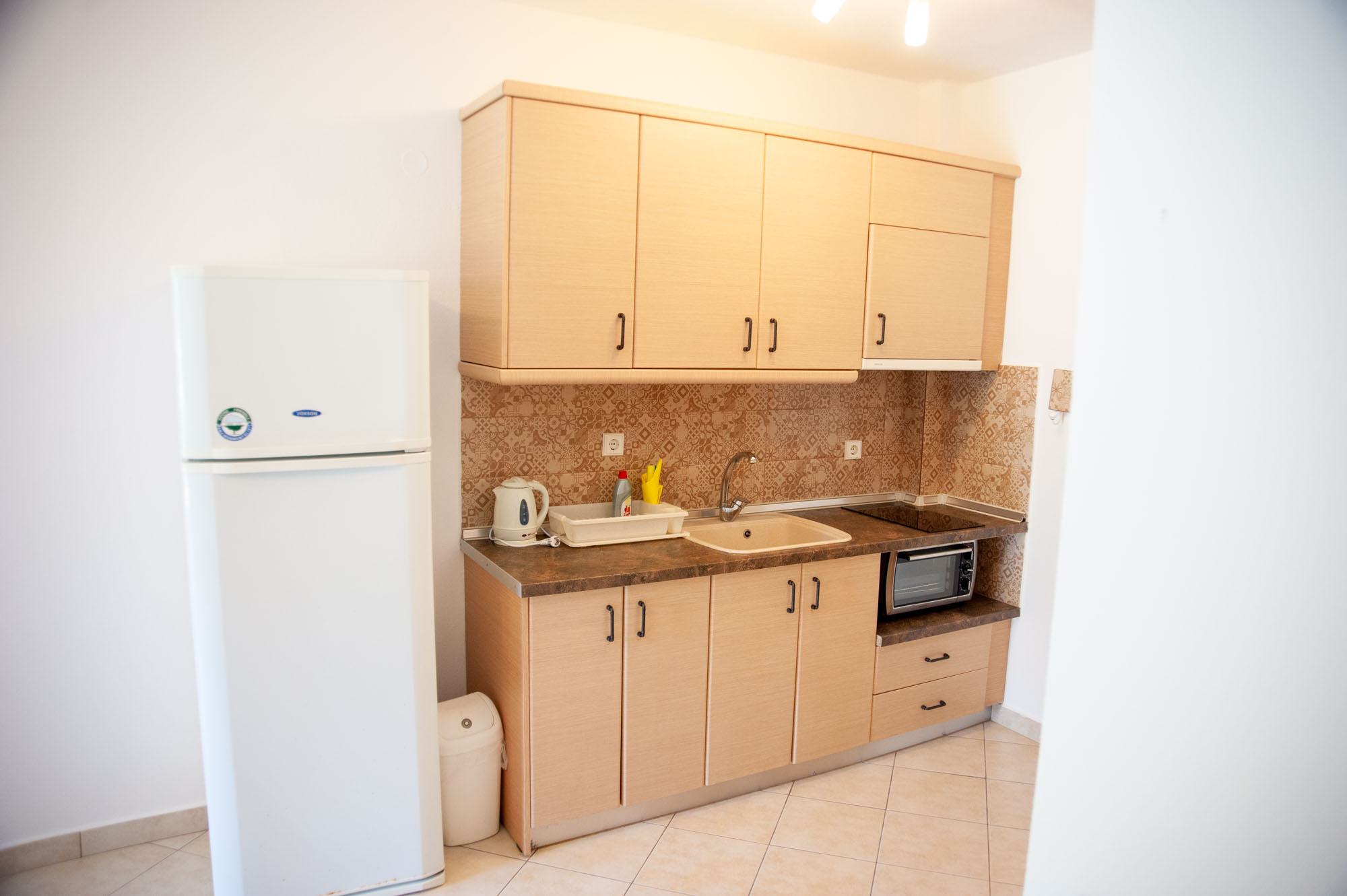 A fully equipped and functional ground floor apartment ideal for families. There is a double bed, a separate bedroom with a double and a single bed, a bathroom with shower cabin and a porch with a set of dining table with chairs overlooking the garden and the pool. A baby bed can be provided upon request.